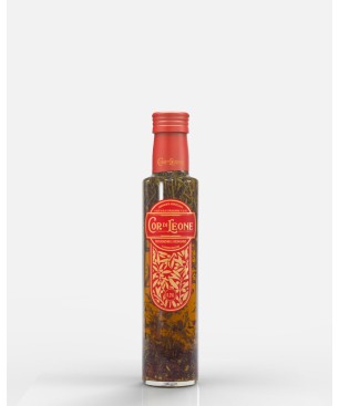Prodotto per infusione di peperoncini, rametto di rosmarino in olio extra vergine di oliva.